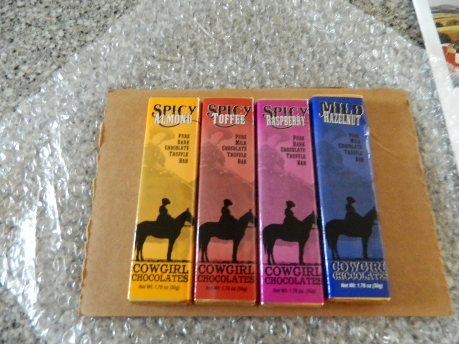 I received the Spicy Toffee, Spicy Raspberry, Spicy Almond and Mild Hazelnut. I tried the Mild Hazelnut as soon as it arrived and after trying the rest I found this one to be my favorite. The three spicy bars had a serious kick to them! The head cowgirl forewarned me but all I kept thinking was there was noway chocolate could be all that hot. The first bite of the Spicy Toffee definitely made a believer out of me. Don’t get me wrong, as a fan of spicy foods I thoroughly enjoyed trying each bar. My husband who never eats chocolate really liked the spicy bars as well and I even caught him sneaking a couple extra pieces aside from the one I made him try.