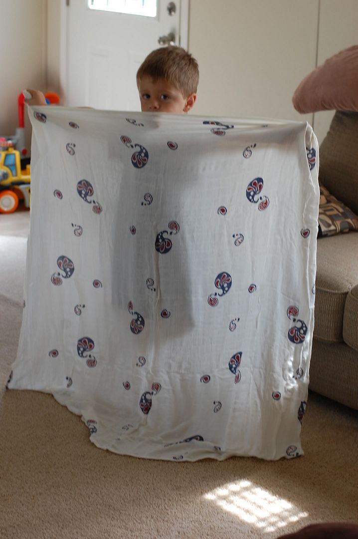 We just recently received the aden+anais Bamboo Muslin Blankets and all I can say is WOW! Seriously, we have used muslin blankets since he was little (these are his preferred blanket while taking a bottle while I rock him), but I had yet to feel a blanket as soft as the aden+anais Bamboo Muslin Blanket. Even my four year old asked if he could have one to use because they are so soft! Might sound crazy but these blankets are a fantastic size and yes, my four year old could use it to cover up with. Here is is holding it up to show just how big it really is.