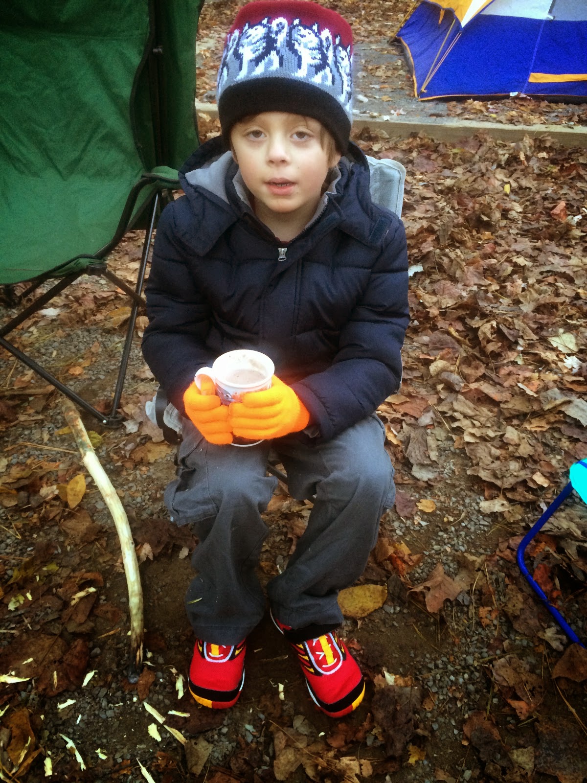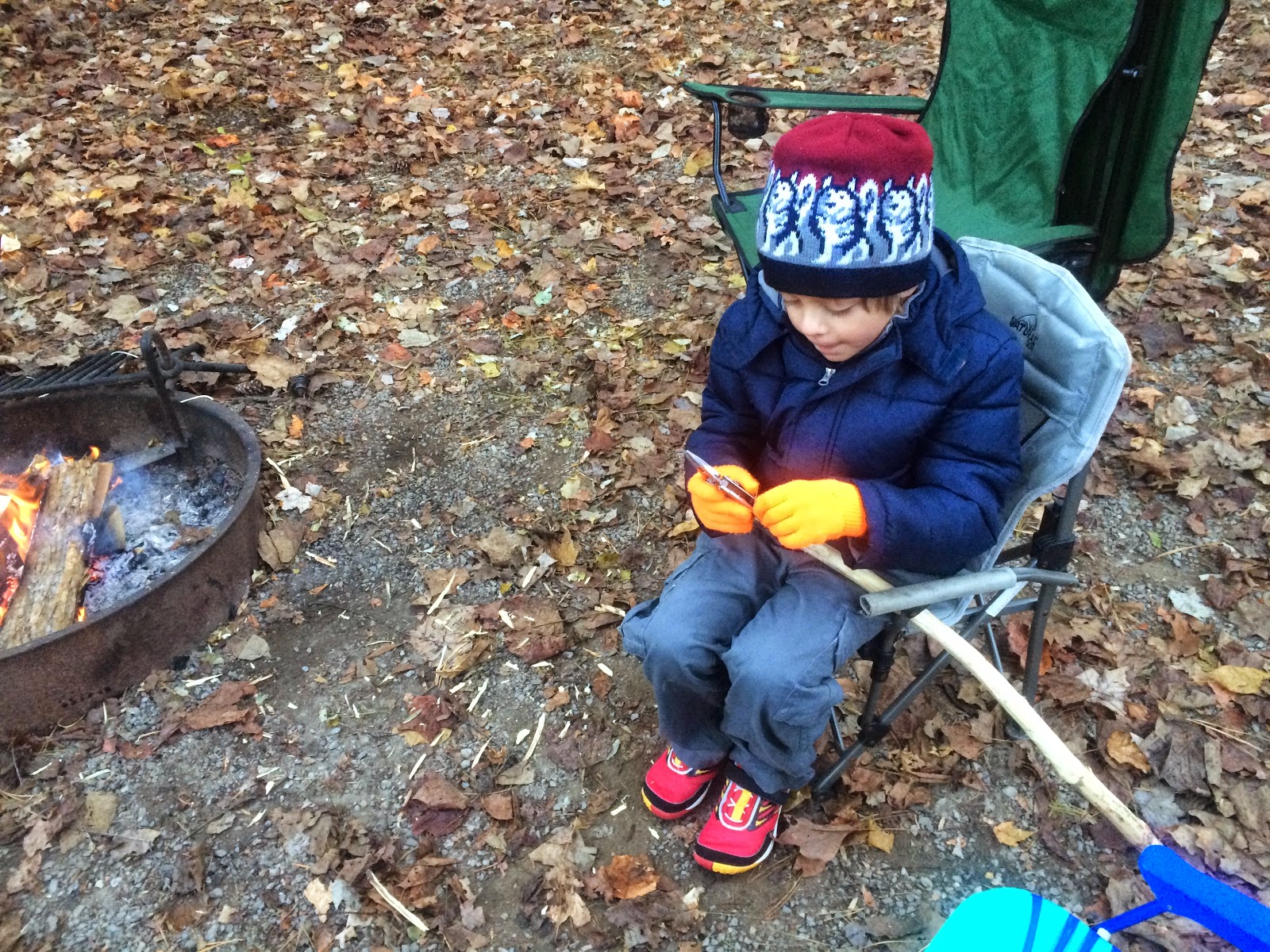 Our seven year old was the first one out of the tent and he decided he would whittle while waiting for his hot cocoa to get ready.
