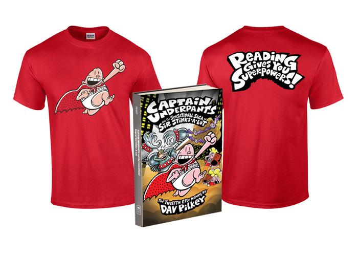 Captain Underpants and the Sensational Saga of Sir Stinks-A-Lot Prize pack that includes the book and a Reading Gives Superpowers tee