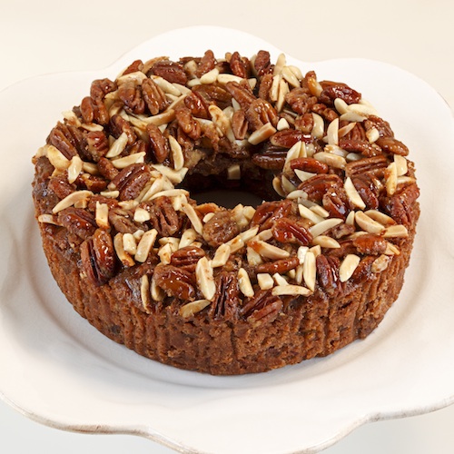 This moist and delicious cake starts with chunks of apples from Washington State that are glaceed to bring out their essence. From there, they are sprinkled with cinnamon and folded into a honey batter and smothered with native Texas pecans. And just before each cake is popped in the oven, it is hand decorated with a generous topping of pecan halves and slivered almonds.