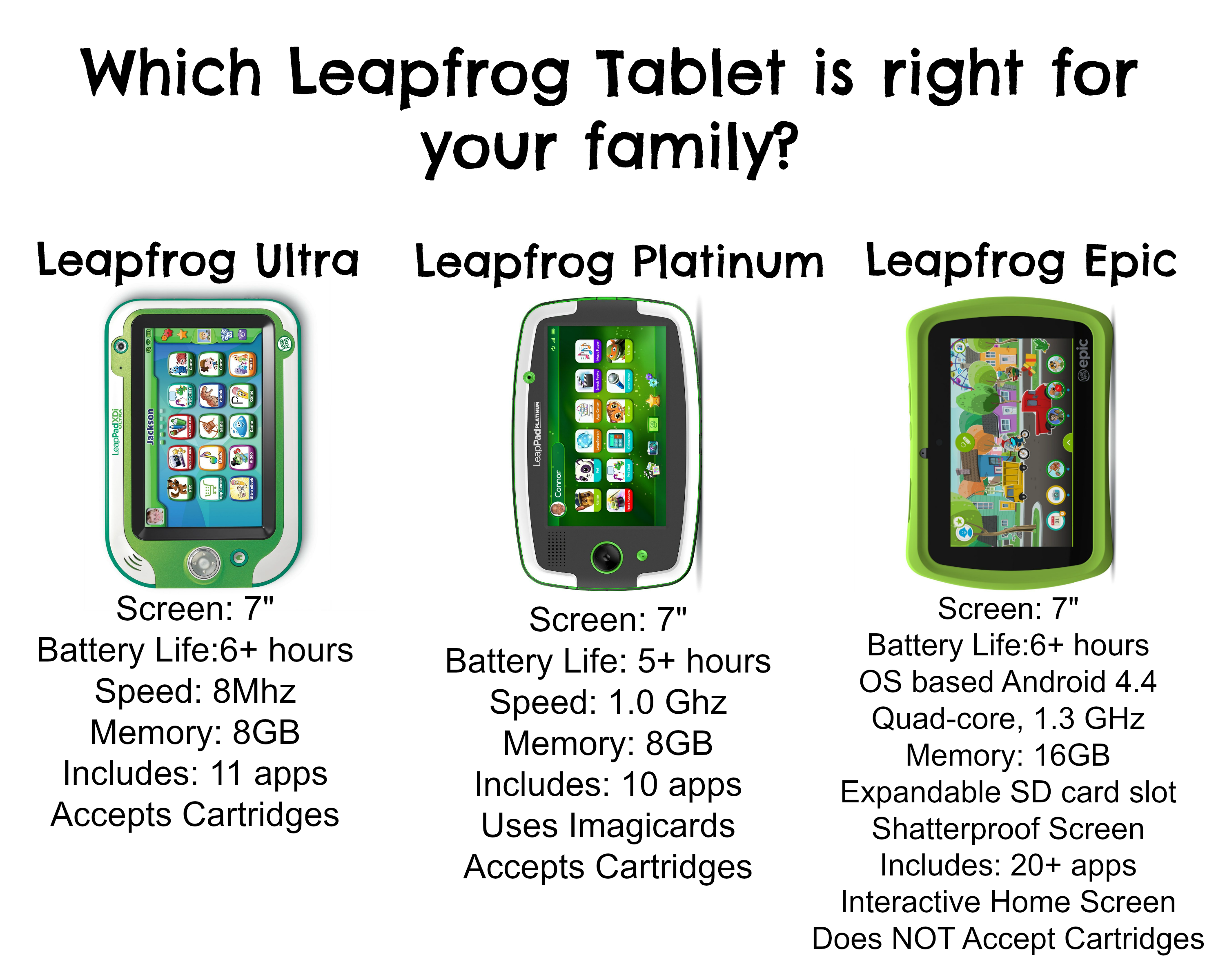 I hate to say it, but the holidays are almost here. Here is a look at the Leapfrog Ultra, Platinum and Epic together.We have been Leapfrog fans for many, many years and this company has yet to disappoint. From DVD’s, infant/toddler toys to their handheld devices, we have tried and used them all in our home.