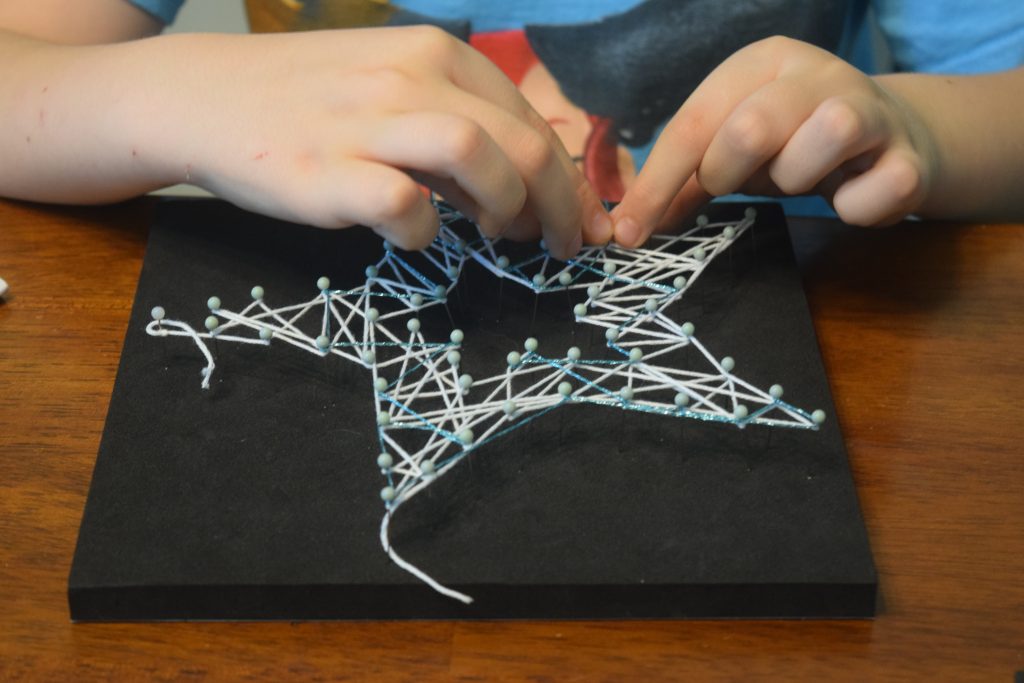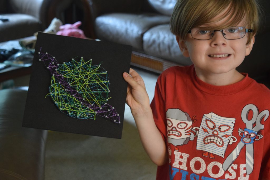 Davis, my ten-year-old got a little frustrated at times because his string would slip off the pins pretty easy, but in the end, he got it. It’s one of those crafts that definitely takes patience and fine motor skills.