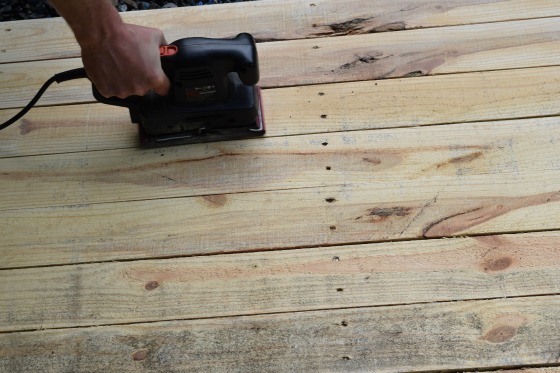 After that, my husband begin sanding the pallet. He didn’t sand it a ton but smoothed it out a lot to give it a nicer look, which also helped it to be easier to paint.