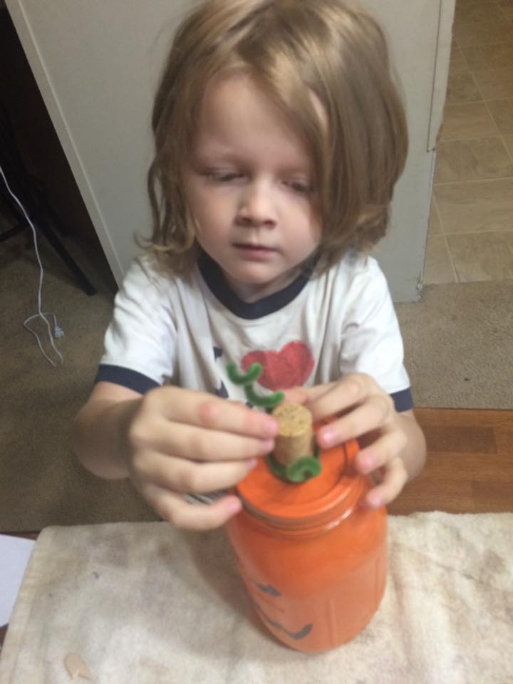 Now this kid is a Mod Podge King and he wanted to use that instead of using school glue for attaching his face. I used a matte finish Mod Podge over the top of the jar, let him put his jack-o-lantern pieces on it and then I gave it one last coat.