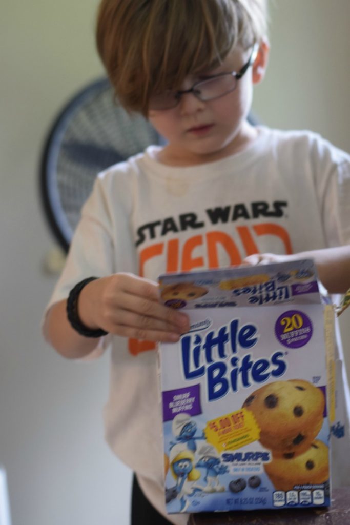 With the release of Smurf’s: The Lost Village actually landing on National Blueberry Day, we decided to have a little fun with snacks for our family movie time. I let the boys brainstorm on ideas and ways to incorporate their Entenmann’s Little Bites and Smurfs into fun creations. Then we headed off to the store.