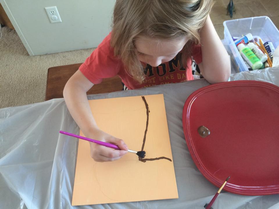 Very lightly I outlined where the tree trunk was going to be so that my four-year old would have an idea of where he should paint. It was funny because when he painted a very tiny square at the top of his trunk, he looks up very proud and says “I’m done!”. Then he realized he needed to paint the entire trunk brown.