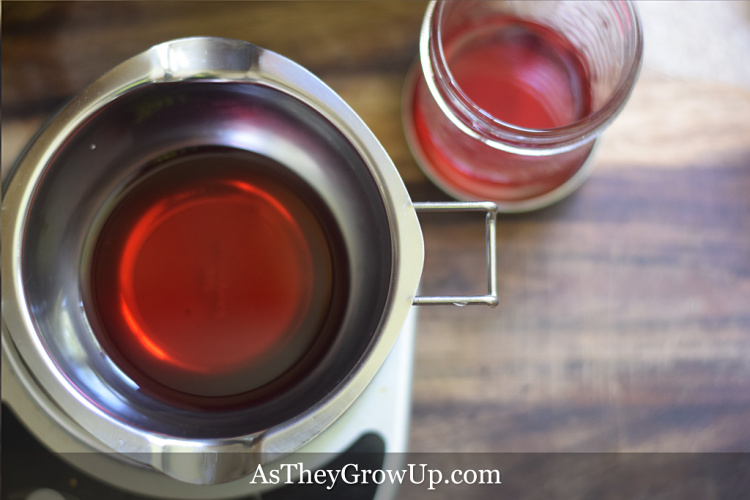 If using a jar, place it down into a saucepan that has 1-2 inches of water in the bottom. Place saucepan over a medium-low burner until the wax is melted. Stirring occasionally.