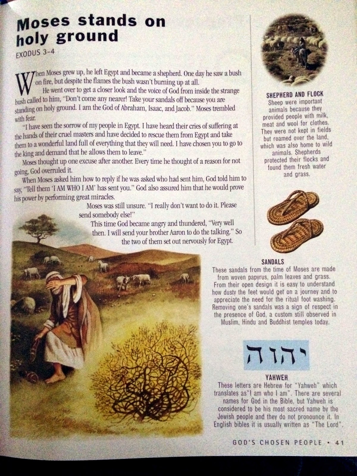 This picture is Moses Stands On Holy Ground. My three year old loves the story of the burning busy. He has it in his Bible flap-book and in another Bible stories book. We read this story at least once a day and even in the Illustrated Family Bible Stories