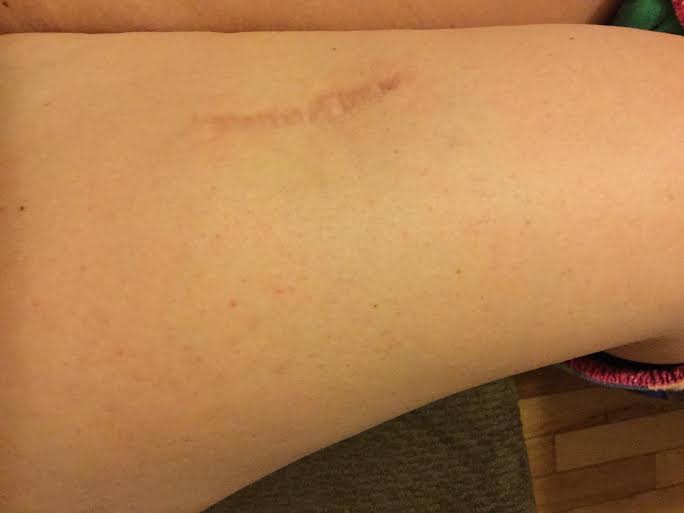 Sentinel node biopsies are not typical for stage 1 patients. However, because of the regression and prior node swelling, my dermatologist demanded I get them tested. I waited until Caroline was 7 weeks old to have this done. The process was pretty involved. The first day I spent a couple hours getting dye injected into my leg and put in and out of a machine resembling that of an MRI machine. The surgery was the very next day where thankfully only one lymph node was removed because only one lit up. This lymph node tested negative for cancer cells which was a blessing. The struggle was not being able to nurse Caroline for a full 48 hours. It was pure hell on all of us. After the lymph node removal I had a pocket of fluid that would have to be aspirated three times. The aspirations didn’t work for more than a day or two which landed me another surgery to put a drain in place. It was a total pain in the rear (or leg in my case). I literally had to wrap it up and tape it to my leg with the bulb hanging out the top of my pants. The bulb would fill with fluid and I would have to measure, dump and record. That process lasted all of about a week when I got a major infection around the site. Celluitius is not a force to be reckoned with. II wish it on nobody. I have a high pain tolerance and it was enough to put me in tears begging for pain killers. Since that day forward I get a bout of celluitius with every single biopsy I have to have. I have even been known to get celluitis from a mosquito bite. My skin is no longer what it used to be before melanoma.