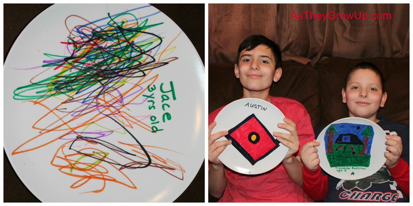 This kit included everything! Circle paper to draw on and markers to work with. The only limits were you own imaginations! I love how this will be a keepsake for many years to come. I can even envision my grandkids using the plate their daddy created when he was little! How cool would that be? It was easy to fill the forms out and mail away our drawings. The finished product was perfect!