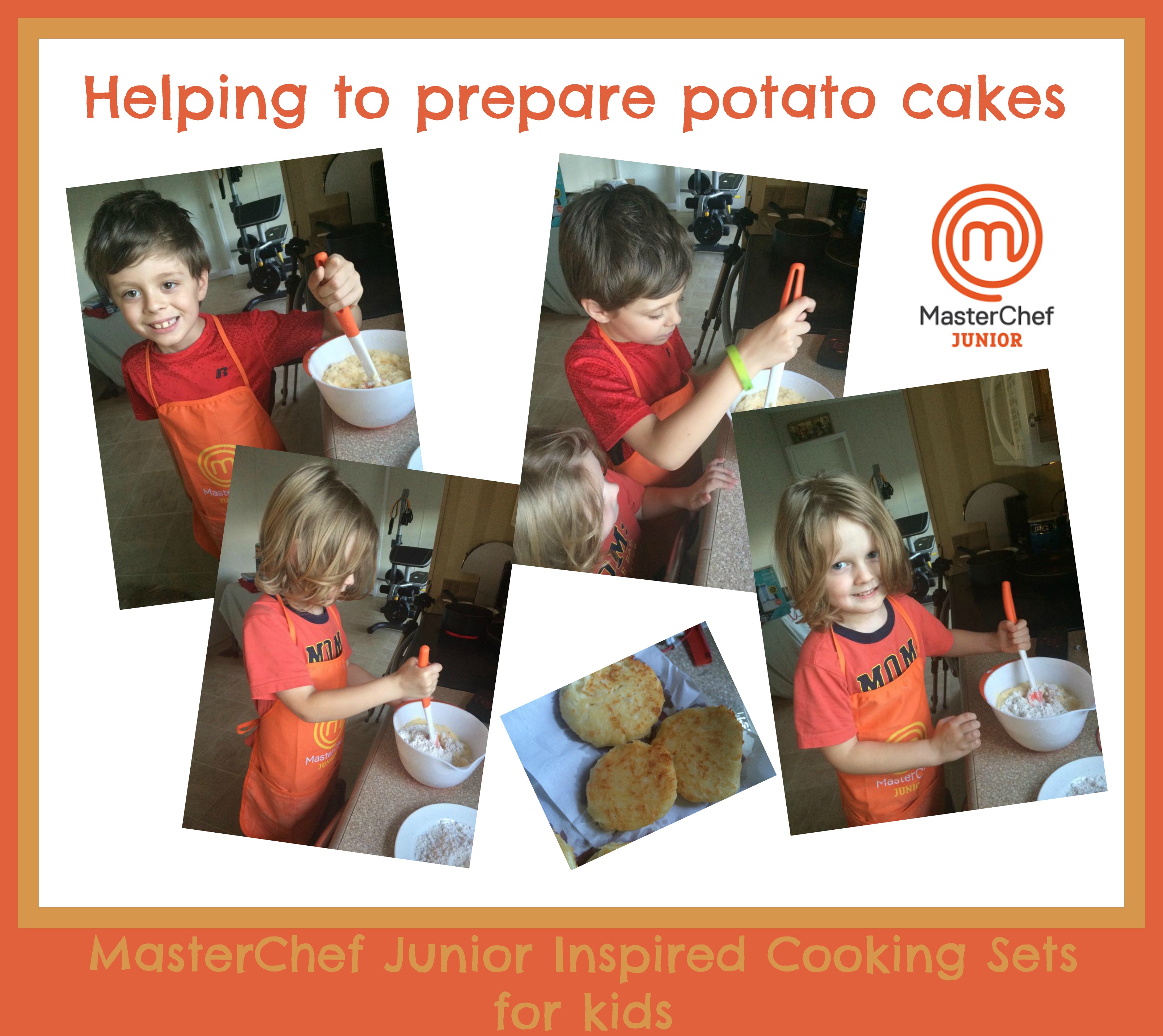 I always find it funny how kids will eat the things that they help make. For example…In the below picture, the boys were using one of the new MasterChef cooking kits to make potato cakes. My four-year old swears he doesn’t like potato anything. If he hears it has potatoes, then he won’t even eat it. Let the kid make his own potato cakes, and he eats them like crazy. For me, it’s the best way to get them to try new foods. I always tell them that if they don’t taste different foods, then how are they going to be a good cook. They have to know how different flavors and spices complement each other.