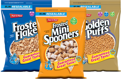 - Kids and parents alike get really excited about our ready-to-eat Malt-O-Meal cold cereals, including the Cooking Light® Taste Test Awards Grand Prize winning Frosted Mini-Spooners®, as well as Cinnamon Toasters®, Marshmallow Mateys® and more! Malt-O-Meal offers great-tasting, affordable cereals priced 20-30 percent less than other national cereal brands. As an extra bonus, they use 75 percent less consumer packaging by ditching the cardboard box for a resealable bag. Just a few of the many reasons Advertising Age Magazine named Malt-O-Meal one of America’s Hottest Brands of 2011!
