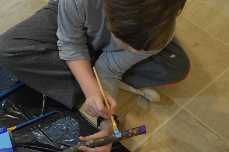 This is one of those activity where I let the boys be as creative as they liked. First things first…we headed outdoors for each to pick the perfect stick. This took some time. Let’s face it, it’s hard finding the “perfect” one.