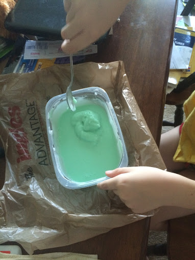 They stirred what they thought was forever (it wasn’t that long) to get the glue and water mixed together and then added two drops of food color. I tried to talk them into adding more food color, but they wanted pastel colors and just adding the two drops was the perfect amount for them to get the color they were looking for.