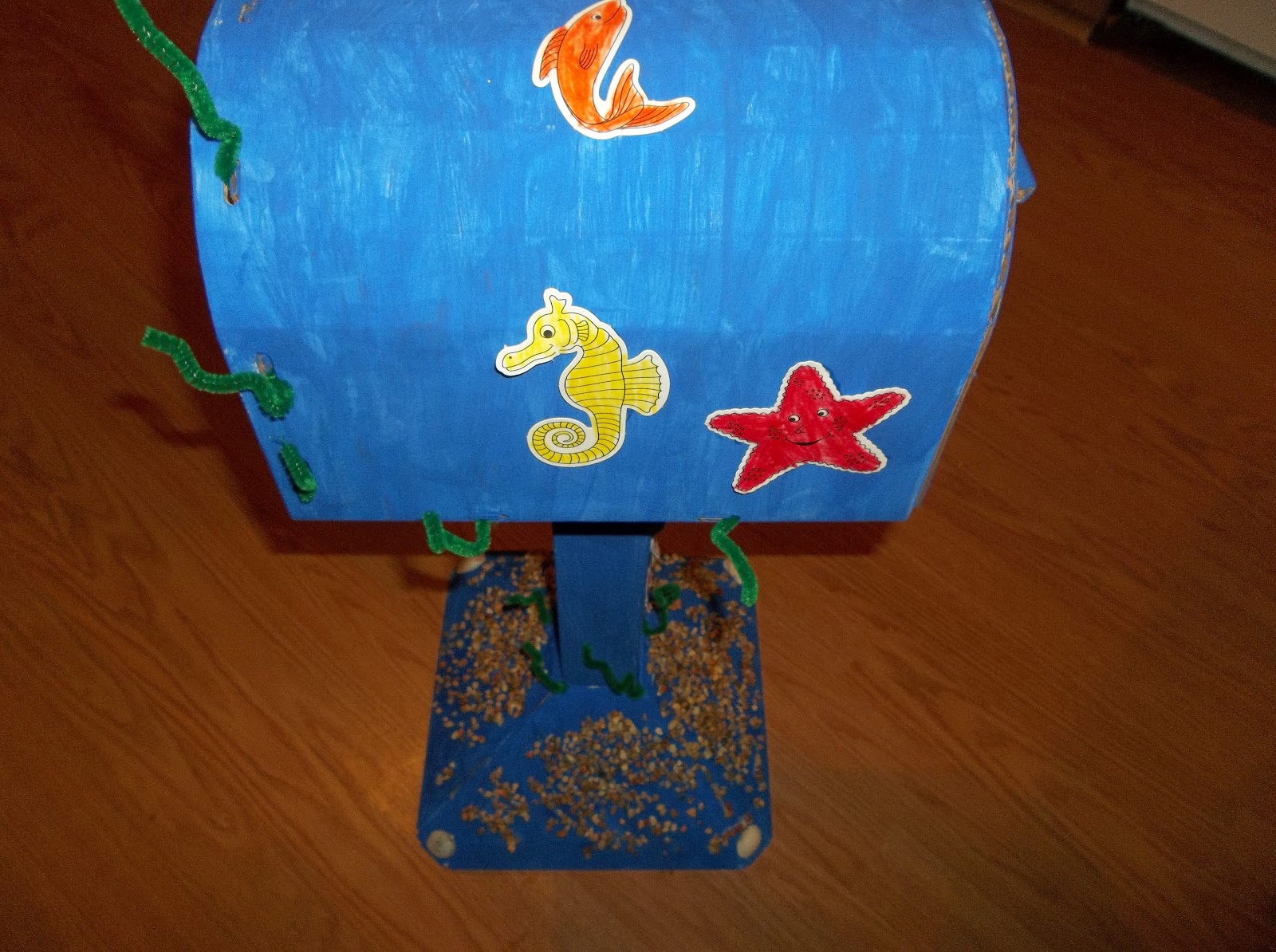 As soon as we opened this box the kids were super excited! Ideas of what to do and how to decorate the mailbox flowed! We have decided to homeschool this year and this was one of our first big projects. They looked through the Eco-Art U-Stick’Ems and picked the ocean themed. Love these stickers because first off they are uncolored so your kids have to use their imagination to decide what they want them to look like. Also they are not sticky so you have to stick them yourselves! We busted out some paint for the project and that was a lesson in patience because they had to wait for each coat to dry. Then the real creativity started. They colored the U-StickEm’s and Xander searched for some green pipe cleaners we had. He used them for seaweed. Next Austin remembered we had some leftover pebbles from our fish so he glued those on the bottom. They used a few seashells from last years vacation to finish it all off.