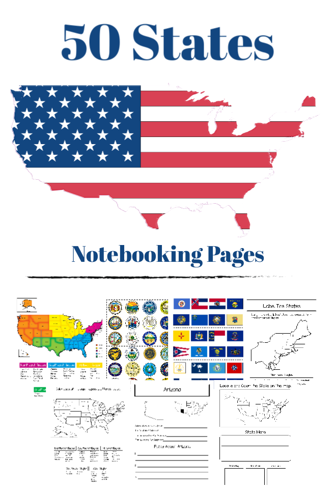 This 119-page 50 States Notebooking Pages goes great with the 50 States Fact Cards. The notebooking journal includes regions on the US, state labeling, color the region, and journal pages for each state. It also has cut and past state seals, flags, and quarters.