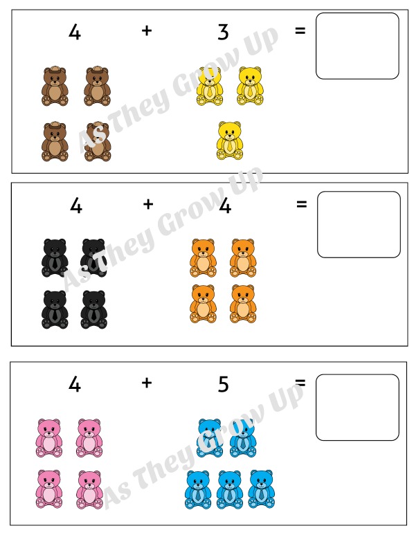 This printable is just too cute! What has worked best for us when using this printable is for the math section, I have designed it so that it can be printed off and then laminated. This has provided us with the opportunity to use it over and over again. My little guy places his counting bears on the sheet and then uses a wet erase marker to place his answer in the square. We mix these us depending on the day and over time, he has improved so much.