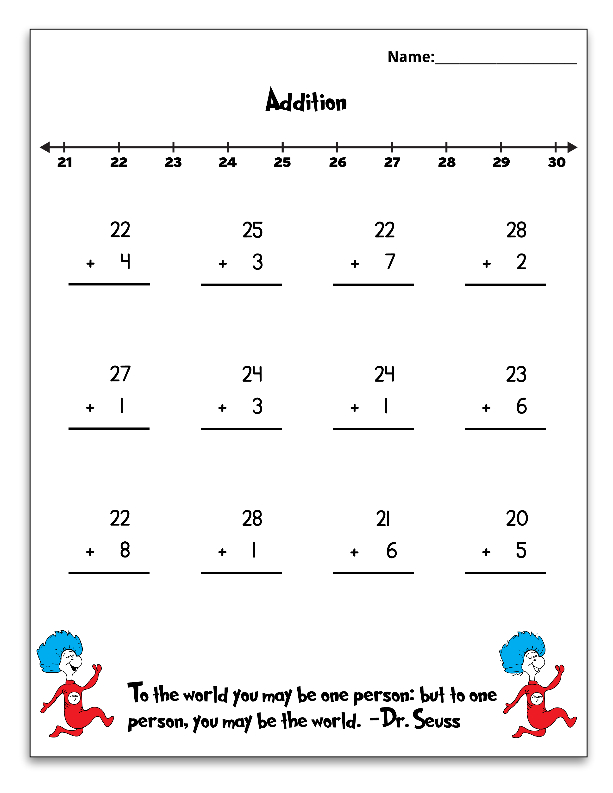 This fun 14-page Dr. Seuss Printable Math Pack is perfect for grades Kindergarten through first grade. I originally created this set when my youngest was in kindergarten. It went perfect with our week of Dr. Seuss fun. At the bottom of each math page, I included a fun little Dr. Seuss quote.