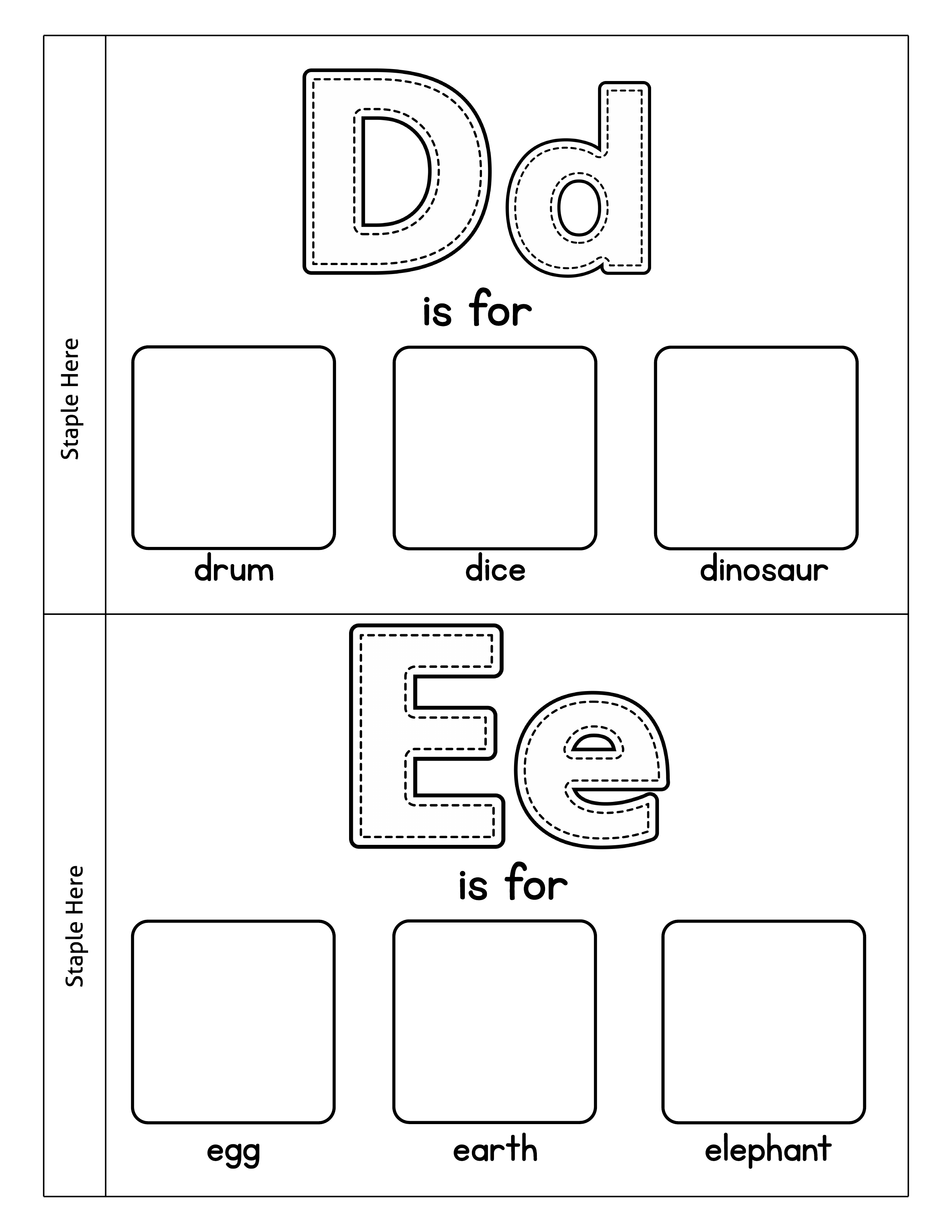The first 14-pages of this printable is the actual book that you’ll assemble. The additional pages are the objects/animals that go along with each letter.