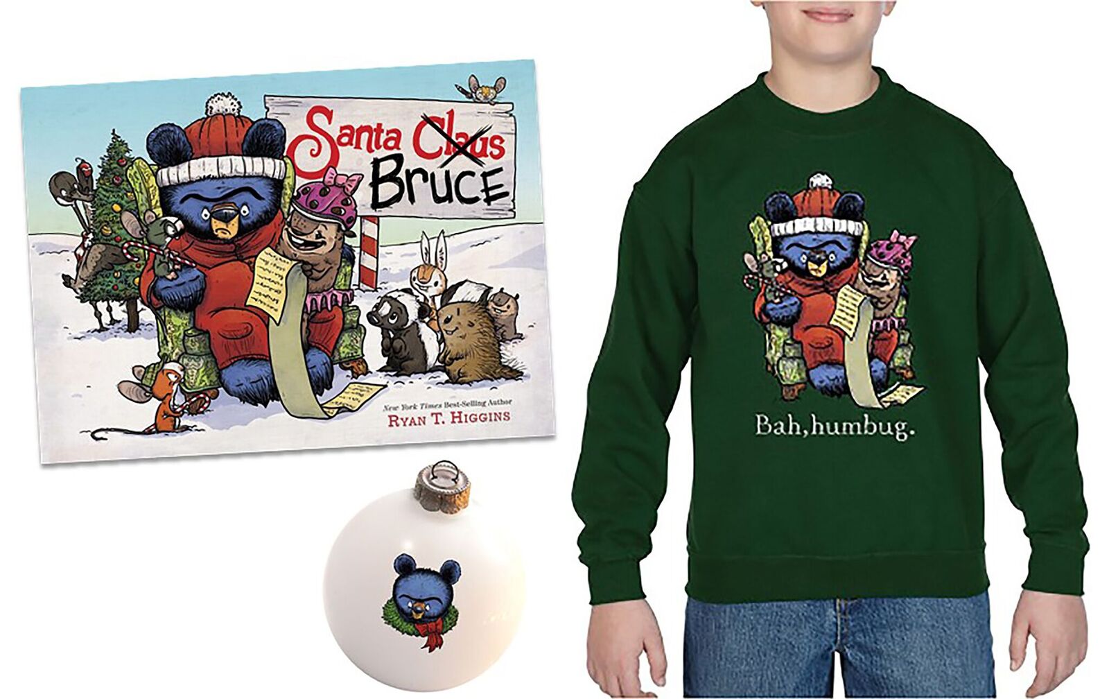 One As They Grow Up reader will win a Santa Bruce Prize Pack that includes: A copy of Santa Bruce, Branded Ornament, & Kids-size “Bah, humbug” sweater.