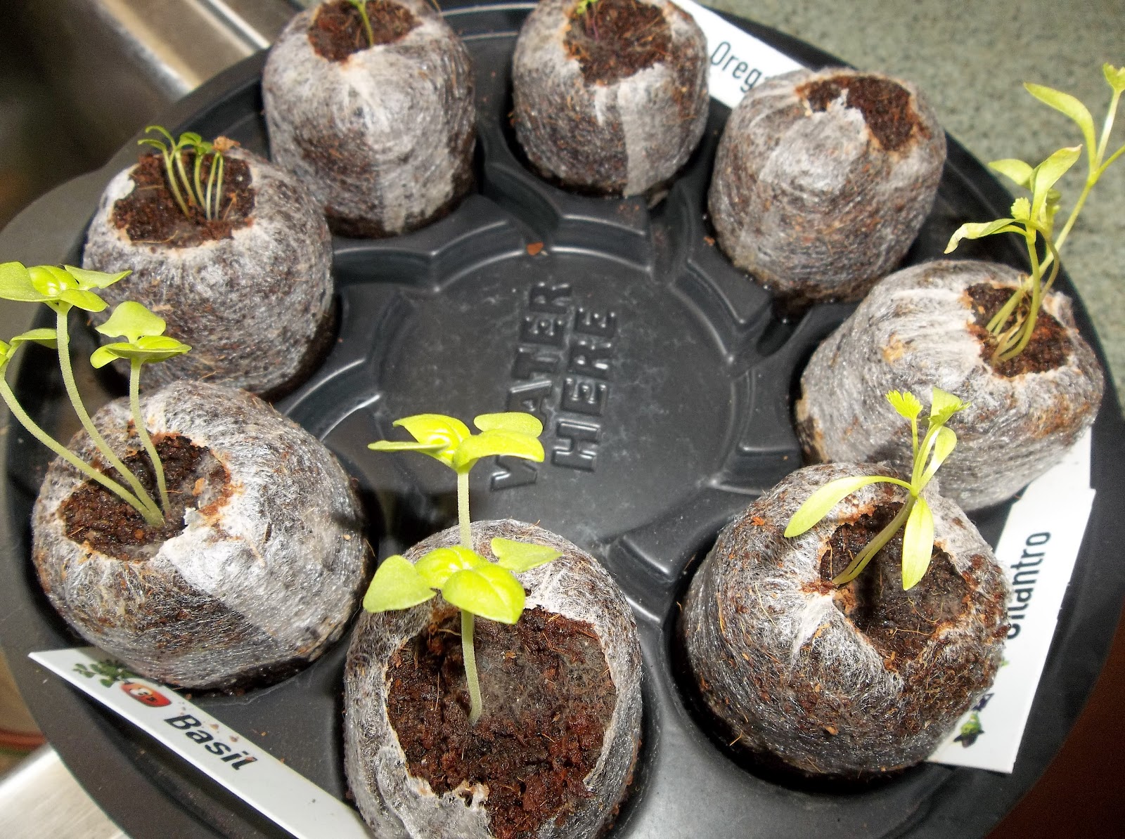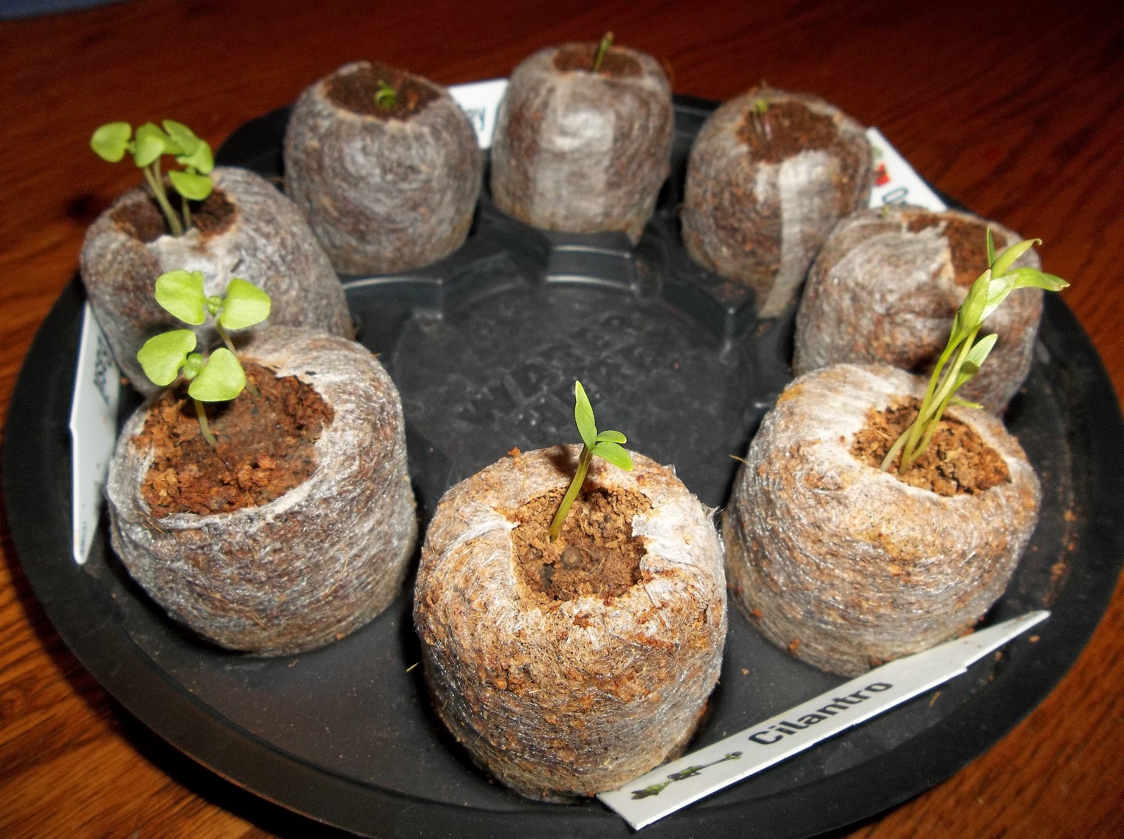 | About 4 weeks in! Hard to see but all have sprouted but one. We were away and haven’t replanted that one yet! |